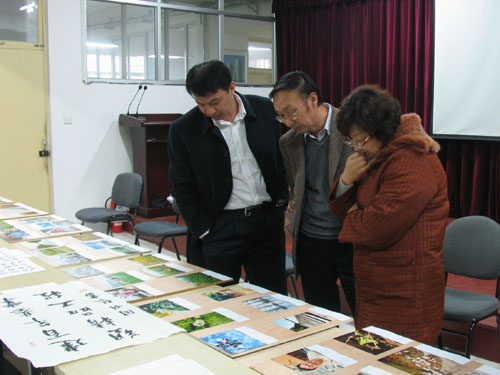 喜迎企業(yè)60年首屆書畫攝影展——專家評(píng)審組認(rèn)真審閱作品