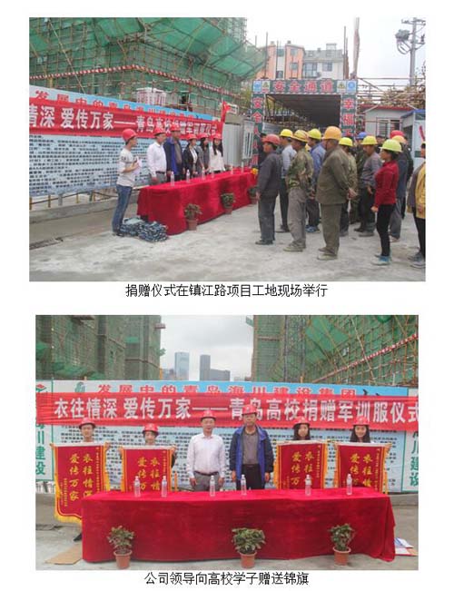 10月16日下午,由青島理工大學(xué)土木學(xué)院學(xué)生會(huì)牽頭組織,青島大學(xué)和中國(guó)海洋大學(xué)共同參加的“衣往情深,愛傳萬家”軍訓(xùn)服捐贈(zèng)儀式,在青島海川建設(shè)集團(tuán)鎮(zhèn)江路項(xiàng)目工地隆重舉行。來自青島理工大學(xué)市北校區(qū)、黃島校區(qū),青島大學(xué)和中國(guó)海洋大學(xué)的學(xué)生組織代表出席了捐贈(zèng)儀式,青島海川建設(shè)集團(tuán)副總裁李尊強(qiáng)、團(tuán)委書記王群、六分公司都市逸品項(xiàng)目部經(jīng)理劉峰官以及所在項(xiàng)目部分工人代表出席了捐贈(zèng)儀式。