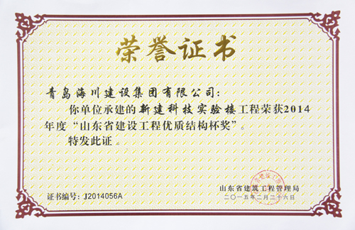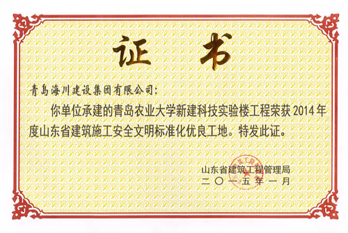 最近,七分公司青島農(nóng)業(yè)大學新建科技實驗樓工程先后從山東省建筑工程管理局捧回了分別于2015年一月和二月頒發(fā)的兩項省級榮譽證書——榮獲“2014年度山東省建筑施工安全文明標準化優(yōu)良工地”和榮獲“2014年度山東省優(yōu)質(zhì)結(jié)構杯獎”。消息傳到工地,大家歡欣鼓舞,一年多的努力終于結(jié)出了豐碩的成果。